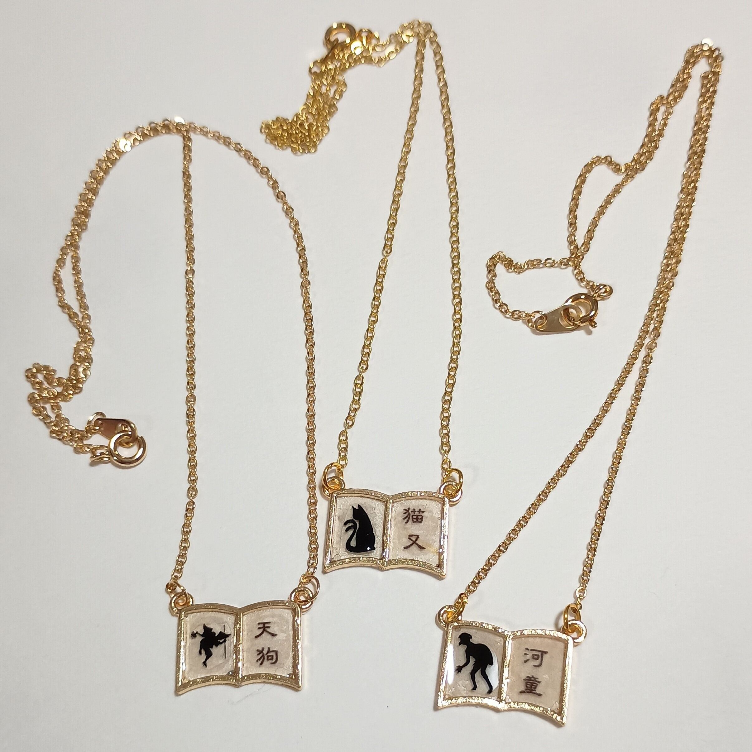 天狗、河童、猫又の豆本をイメージして作りました、ペンダント3種です。裏面にデザインはありません。