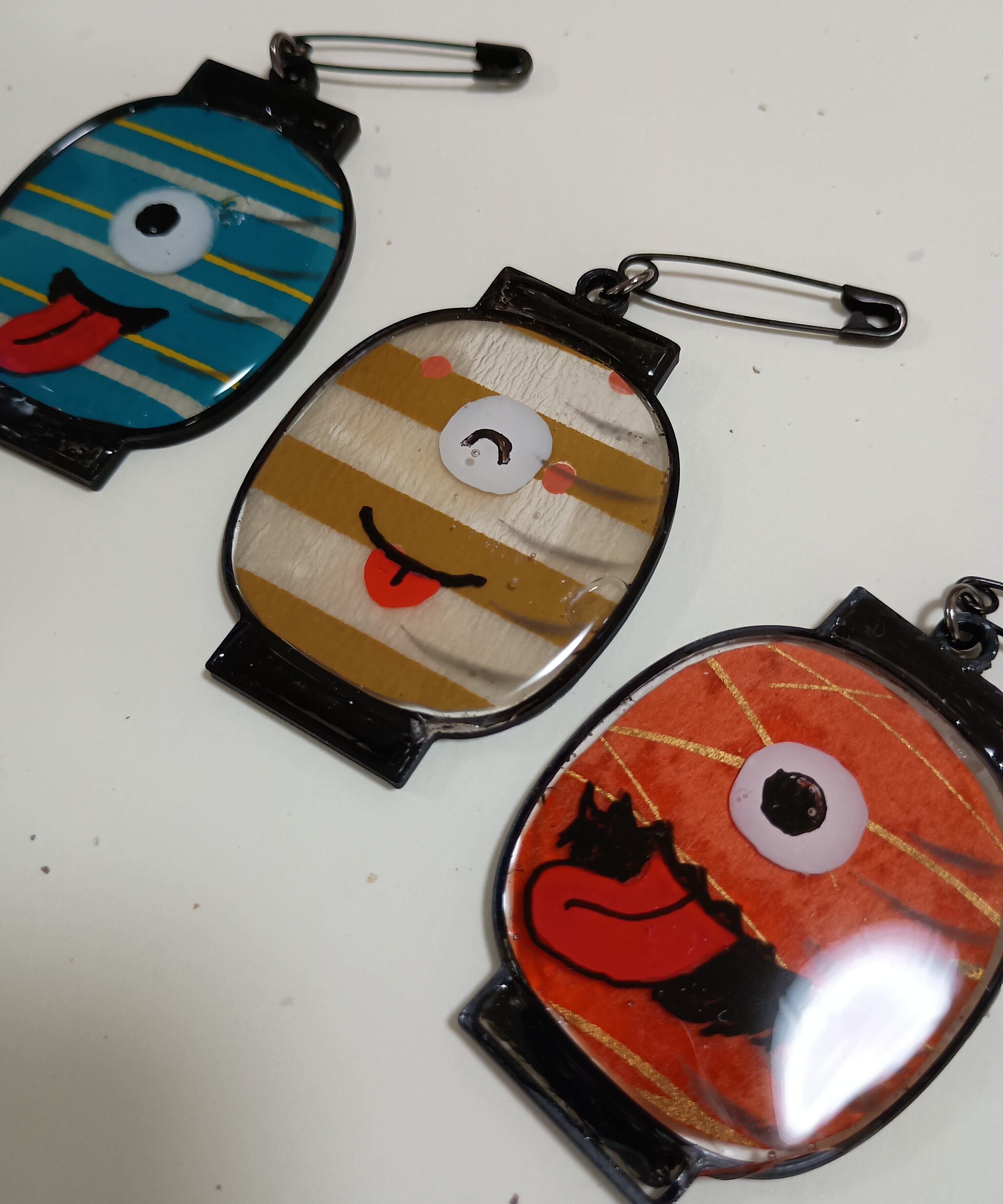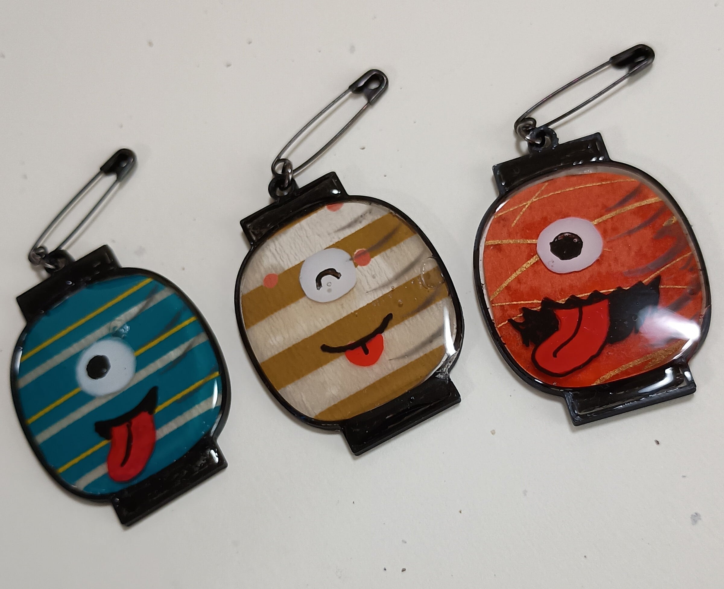 シンプルな安全ピンで留められますので、お気軽にあちこち付けて下さい。