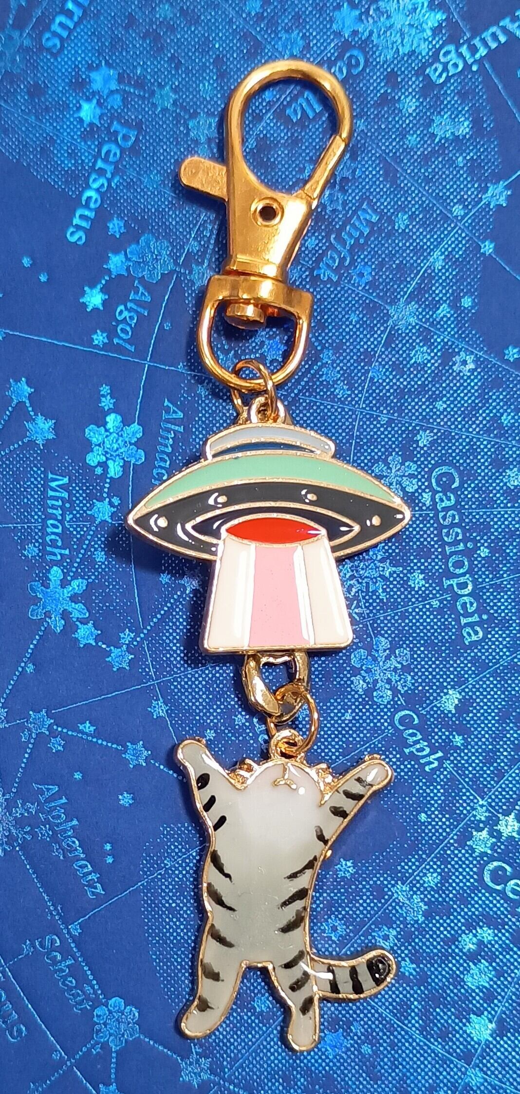 UFOを召喚している?吸い上げられている?猫のバッグチャームキーホルダーです。