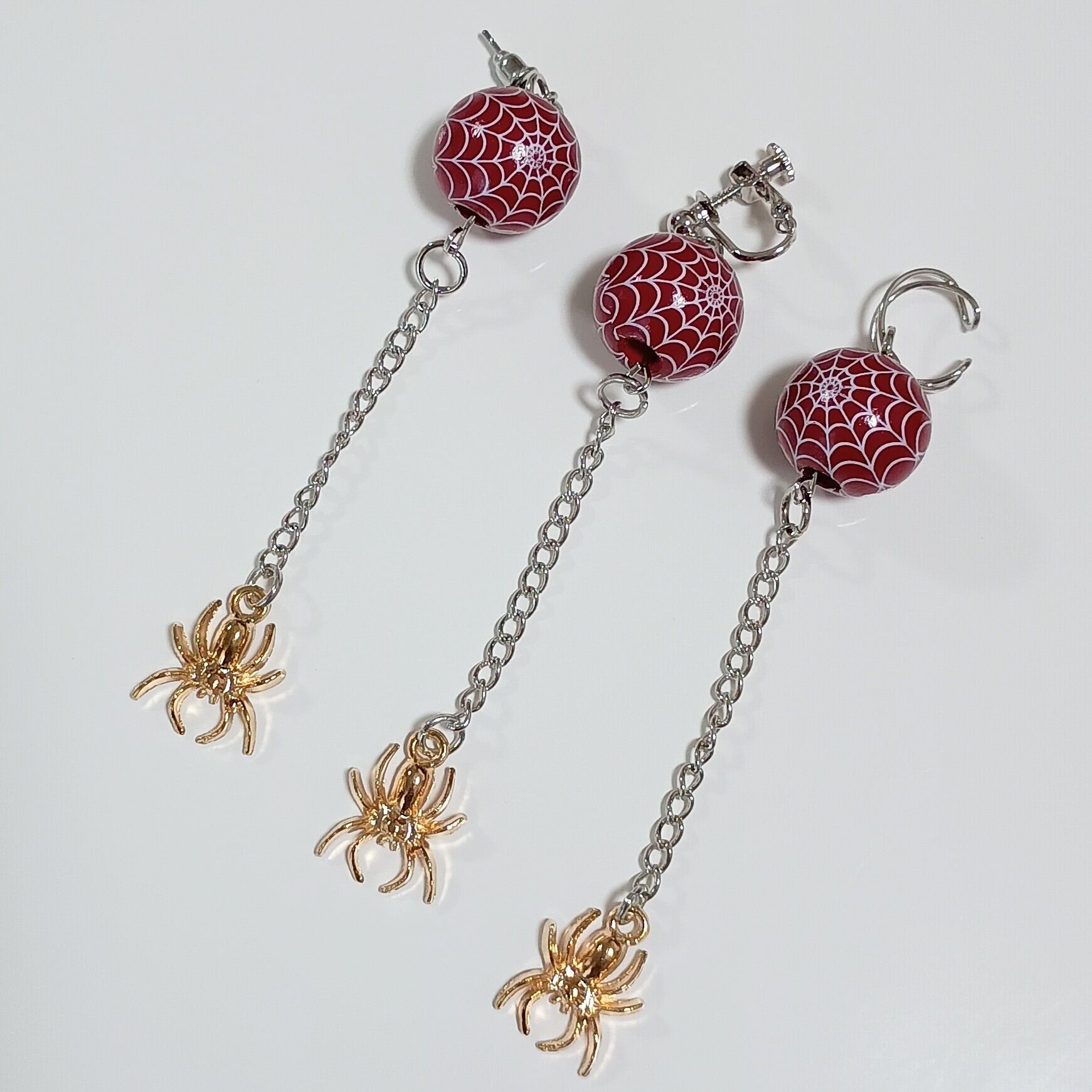 蜘蛛の巣ビーズと蜘蛛チャームを組み合わせた、片耳用ピアスです。イヤリング、イヤーカフに変更可能。オプションよりお選び下さい。