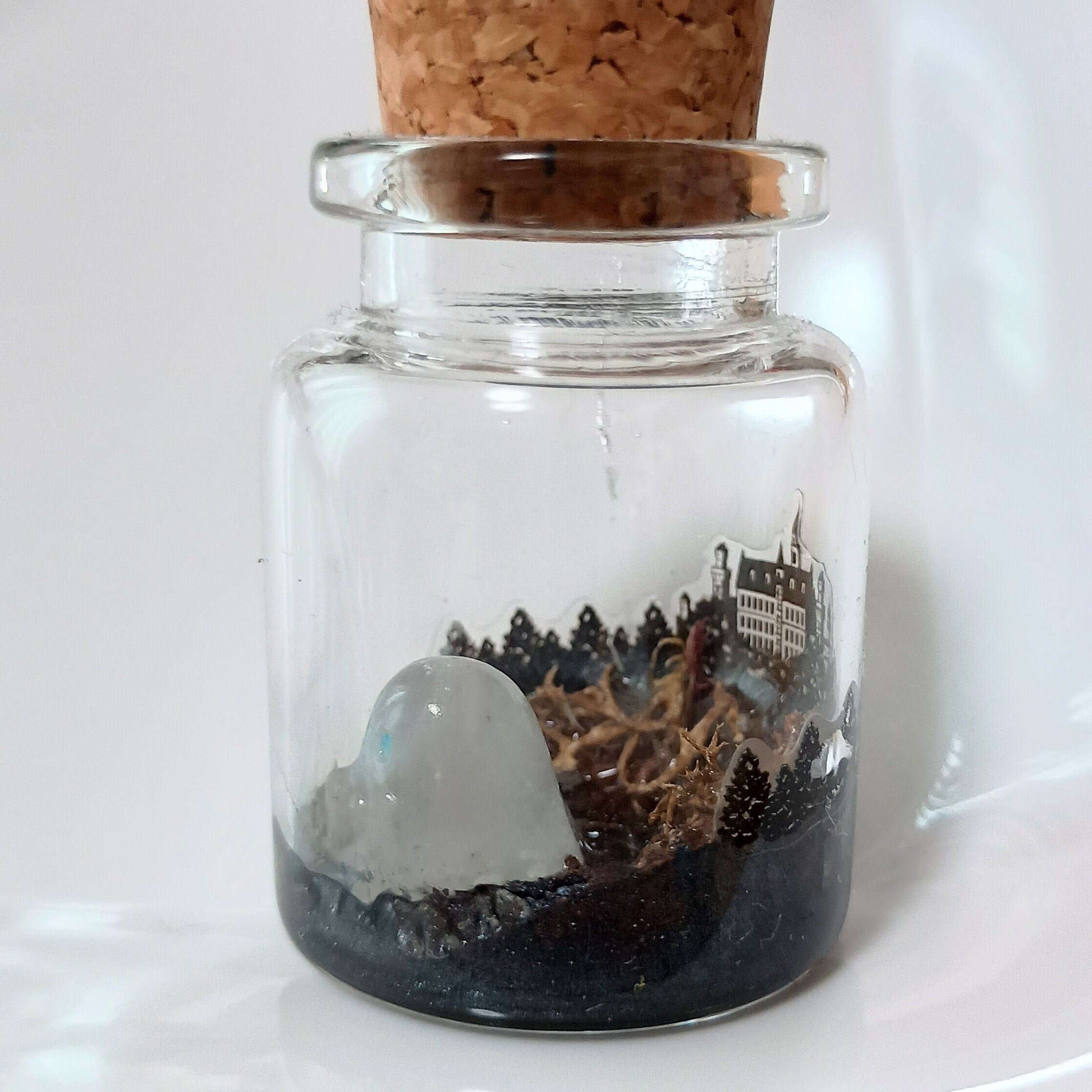 底直径約3cm、高さ(コルク蓋含まず)約3.8cmの小瓶に、一体一体違うゴーストを閉じ込めました。 こちらは 暗い森の洋館・ジェラルド です。 割れないように梱包してお送りします。お部屋にひっそりいかがでしょうか。