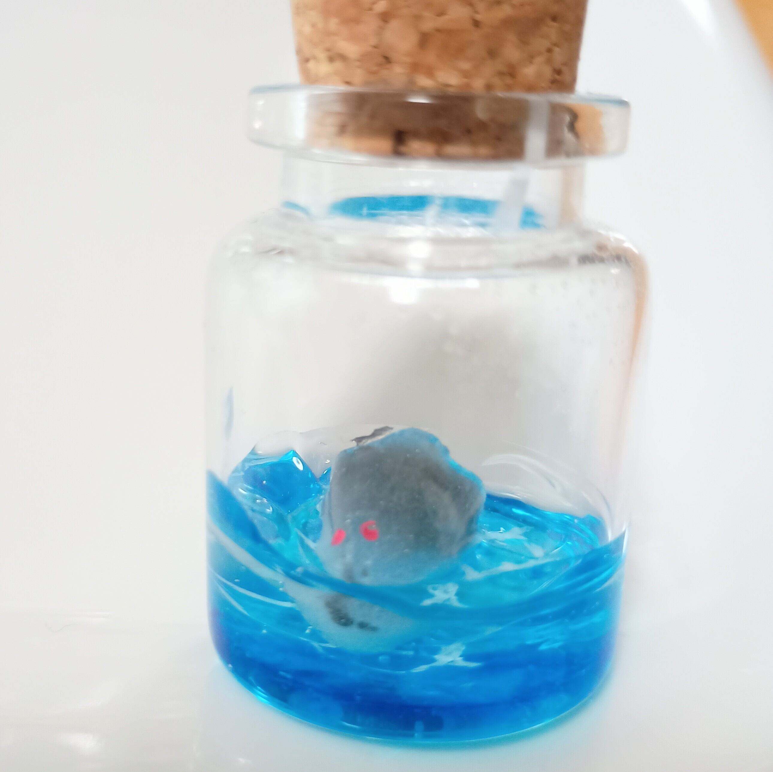 底直径約3cm、高さ(コルク蓋含まず)約3.8cmの小瓶に、一体一体違うゴーストを閉じ込めました。 こちらは 海に浮かぶ・サエモン です。 割れないように梱包してお送りします。お部屋にひっそりいかがでしょうか。